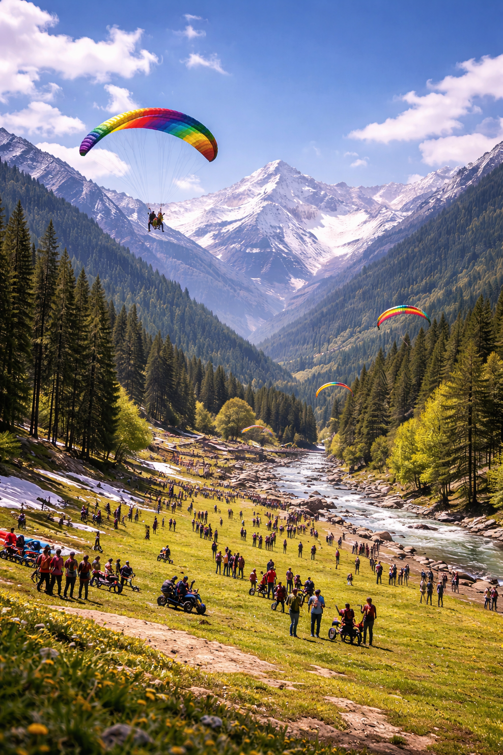 During this tour, you will explore famous attractions like Hadimba Devi Temple, Vashisht Hot Springs, and the lively Mall Road. Enjoy thrilling adventure activities at Solang Valley such as paragliding, ropeway rides, and snow scooter rides. The trip also includes an exciting excursion to Rohtang Pass or Atal Tunnel, where you can witness stunning Himalayan views and snow-covered landscapes.